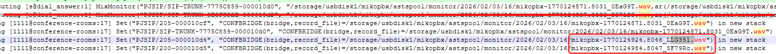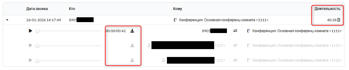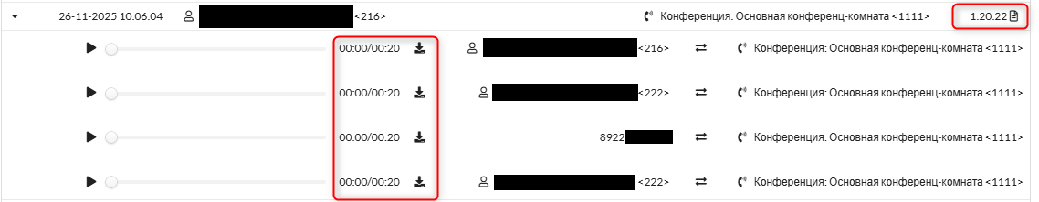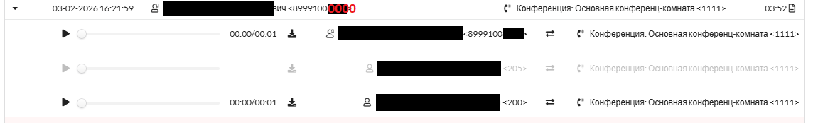 При сценарии участия в конференции только внутренних пользователей телефонии, когда они сами заходят в комнату по ее номеру, запись разговоров ведется корректно и появляется.
