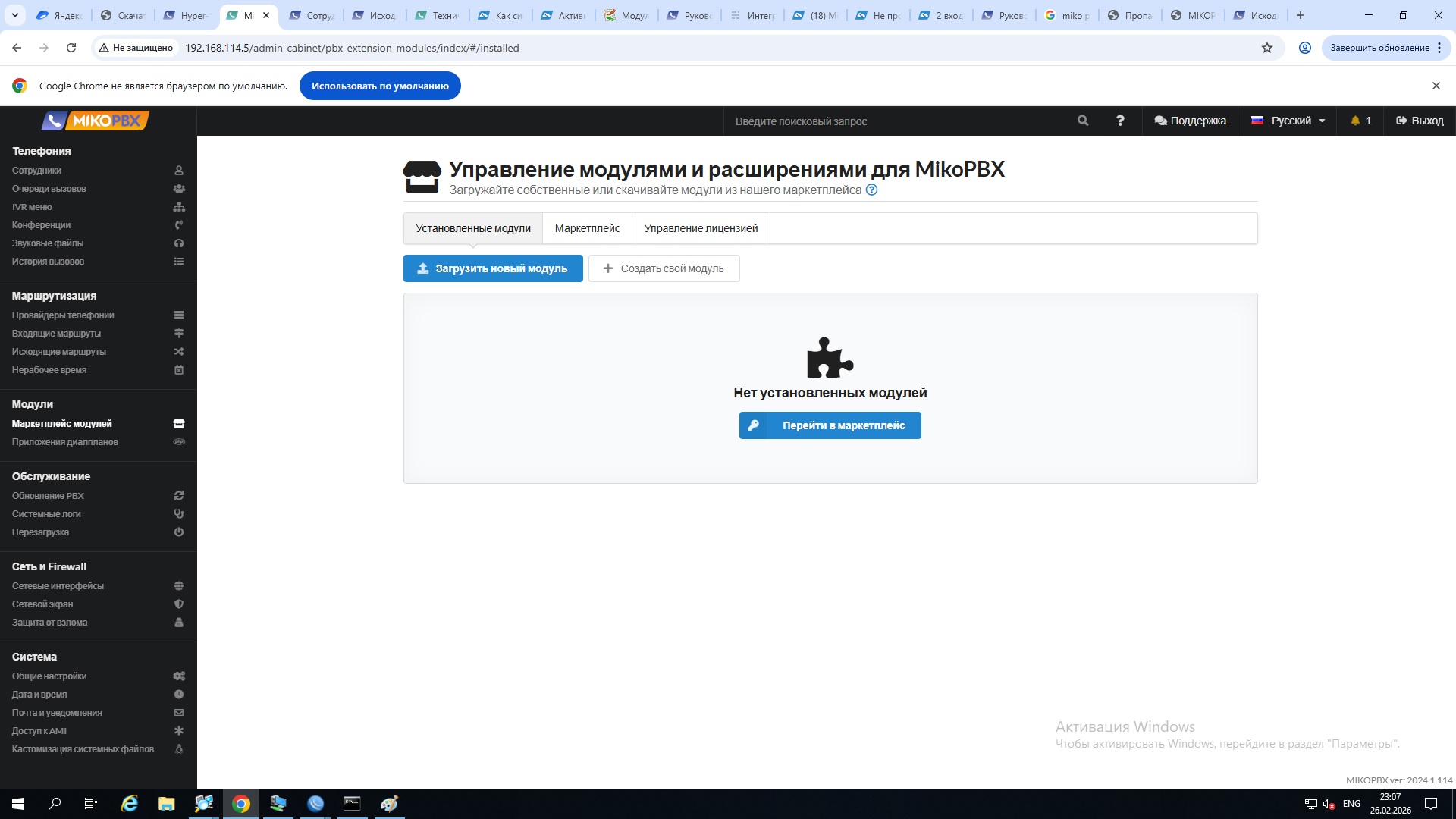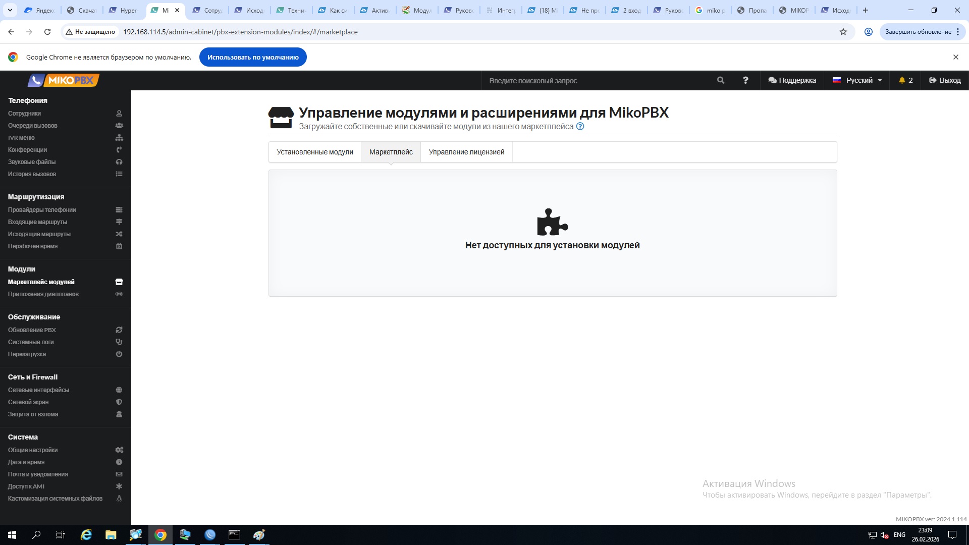 Стоит MikoPBX v.2024.1.114. После 7 дней стабильной работы началась какая фигня, сначала заметил что почему-то время в истории вызовов стало московским, хотя системное время было верным (иркутским). Почитав форум и найдя похожую тему в которой было рекомендовано ребутнуть станцию, сделал ребут и о чудо время в истории стало вновь иркутским. Но дальше - веселее, пропали все установленные модули (управление телефонными группами, управление доступом в систему и расширенная история вызовов), их тупо нет в списке установленных, а маркетплейс пишет: нет доступных для установки модулей. Ну и если без модулей управление доступом в систему и расширенной истории еще можно жить, то без управления телефонными группами просто засада, т.к были расписаны правила какой группе с какого транка звонить, а сейчас соответственно это все похерелось и звонки идут по умолчанию через первый транк из 3. Очень прошу помочь разобраться с данной проблемой.